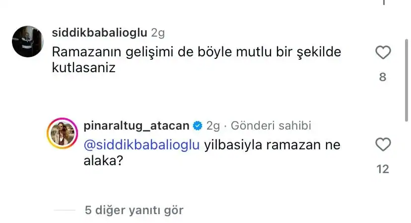 Sosyal medyayı aktif kullanan ünlülerden Pınar Altuğ, yaptığı yılbaşı paylaşımının altına gelen dini içerikli kıyaslama yorumuna sessiz kalmadı. Ünlü oyuncu, takipçisinin “Ramazan” göndermesine verdiği yanıtla dikkat çekti.